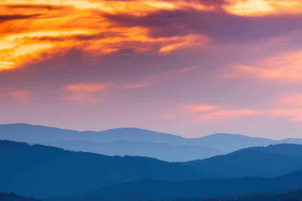 Just after sunset the sky turns completely orange. The mountains below are the low Tatras in Slovakia. A mountainous area that also extends into Poland.
