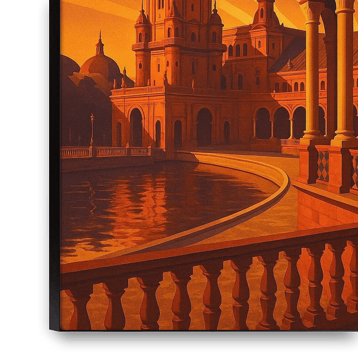 This Sevilla Art Deco poster brings the warmth and elegance of southern Spain to life. Depicting the Plaza de España bathed in glowing sunset colors, the design highlights arched colonnades, Moorish-inspired architecture, and vibrant reflections across the water. The bold lines and radiant beams of light capture the timeless charm of…