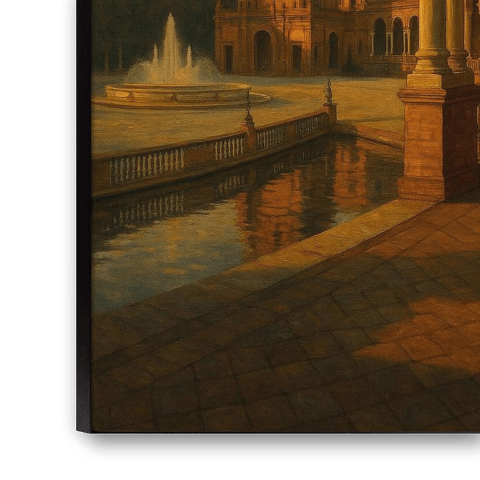 Seville’s Golden Serenity captures the luminous splendor of Plaza de España in the soft embrace of evening. Sunlight pours through the arches, casting rhythmic patterns across the tiled floor while the tower glows like molten amber. The fountain shimmers in gentle motion, its reflections merging sky and stone into one tranquil melody.