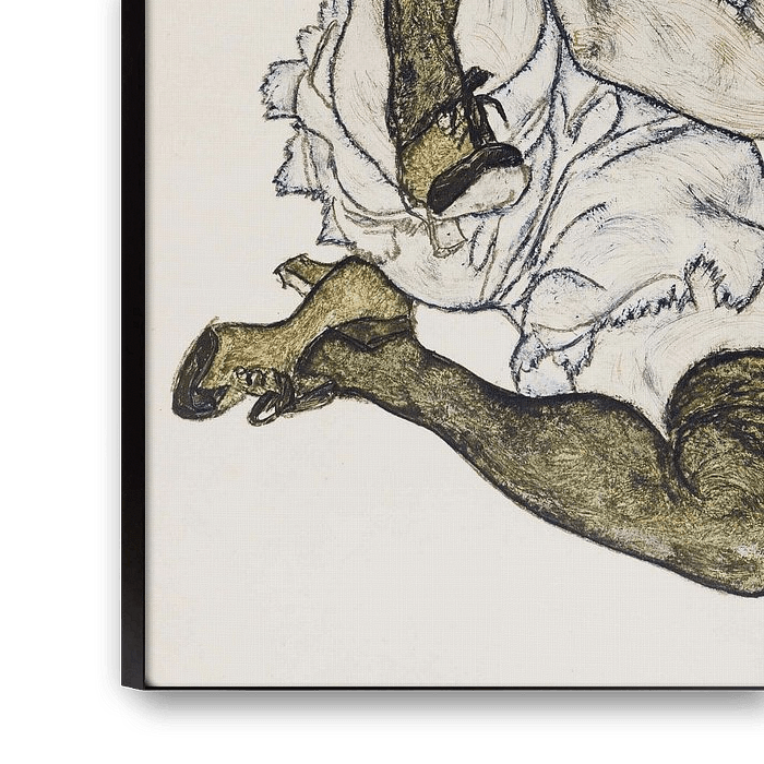 Because of the strong use of lines Schiele can be seen as a draughtsman rather than a painter. Color in the paintings is only applied afterwards. The use of colour, however, greatly enhances the alienating effect. Schiele's works have a cubist character. The painter uses powerful angular lines. As a result, the depicted bodies are experienced as strange and often frightening. Both women and men are ruthlessly depicted in their nudity, in unusual poses. The angular shapes of the body, the unrealistic colours and the often panicky look in the eyes make these portraits very alienating with an explicitly sexual, narcissistic and exhibitionistic character.