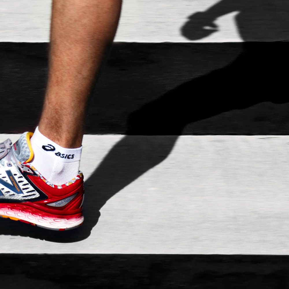 the shadow of a marathon runner on a pedestrian crossing