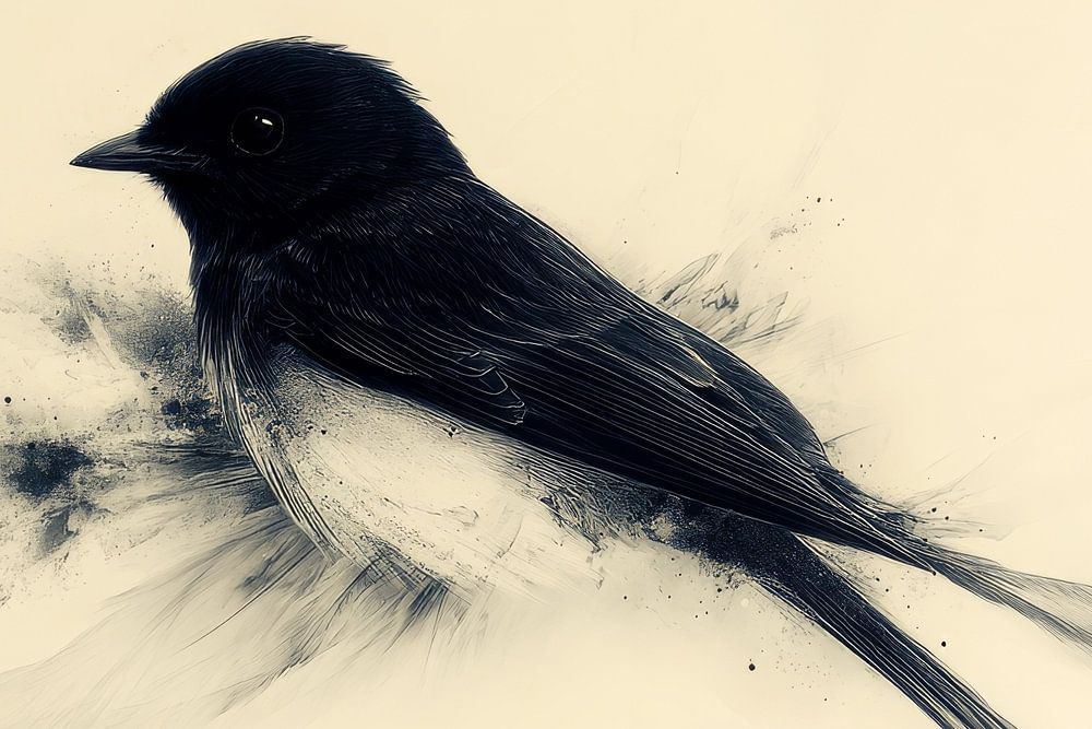 This intriguing artwork depicts a black bird subtly embedded in a soft and ethereal background. The minimalist composition highlights the delicate details of the plumage, while the refined textures suggest a sense of movement. A perfect choice for lovers of understated art with a serene and mysterious feel.