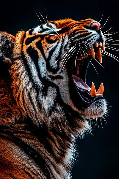 High-contrast monochrome art featuring a tiger’s roar. The dramatic lighting plays with highlights and deep shadows, turning the beast into a living silhouette. It feels mysterious, fierce, and incredibly modern in its artistic execution.