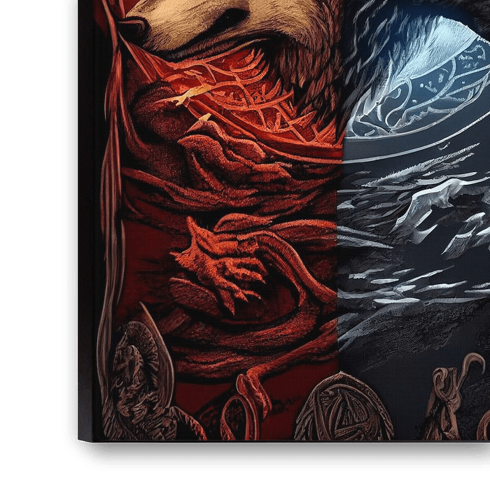 > "Yin and Yang Wolves: Two primal beasts, one of fiery red rage and one of cold, moonlit blue, stare out from a divided frame. A perfect symbol of balanced opposing forces.