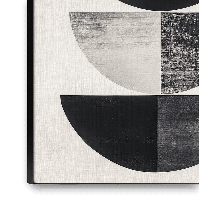 Dark geometry dances on a light background, while shapes line up in harmonious balance. The perfect circle dominates at the top, followed by half moons that create gentle transitions from black to grey. The subtle texture gives the geometric figures a fascinating depth and invites the viewer to immerse themselves in this creative…