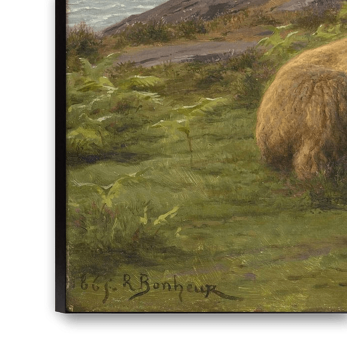 Rosa Bonheur created “Sheep by the Sea” following a trip through the Scottish Highlands in the summer of 1855. In painting this complacent flock of sheep settled in a meadow near a body of water, Bonheur captured a placid moment. “Sheep by the Sea” demonstrates the artist’s commitment to direct observation from nature.
