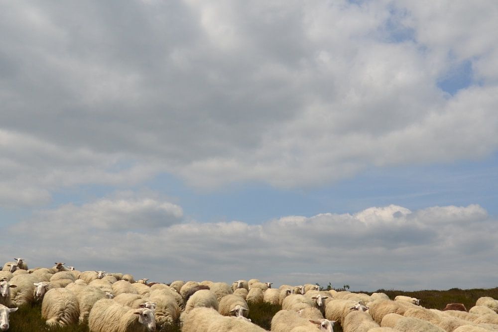 Grazing flock of sheep on Lemelerberg. Shepherd and dog not visible but present. In the background, a lone tree amid heather and grass. Clouds and sun alternate. The flock did not stay in the same spot for long.