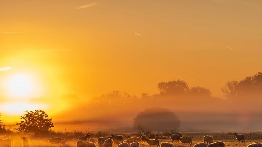 On the Empese and Tondense Heidi the sheep stood in the fog during sunrise.