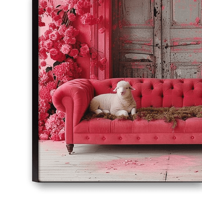 An absurd-poetic scene in which a white lamb lies comfortably on a classic pink chesterfield, in the middle of a distinctly pink interior full of flowers and splashes of paint. Weathered wooden doors, romantic flower owls and peeling paint make this a surreal but warm scene. A nod to luxury, tranquillity and the art of over-the-top styling. Perfect for those who love fantasy, pink tones and quirky wall decor.