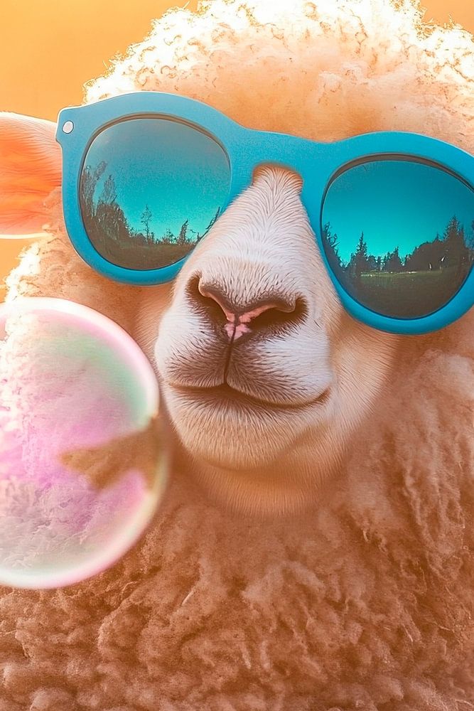 A cheerful sheep with stylish sunglasses sits relaxed in the sunlight and blows a shimmering bubble. This lively scene brings a touch of fun and light-heartedness to any room. Perfect for a child's bedroom or an artistic corner in the living room, it will bring smiles and positive vibes.