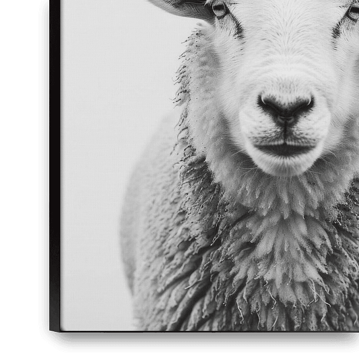 This black and white photograph of a sheep captures the gentle beauty and peaceful expression of the animal. The clear, minimalist image perfectly emphasises the soft texture of the fur and the fine details of the face. A charming work of art that will appeal to nature lovers and lovers of stylish decoration alike.