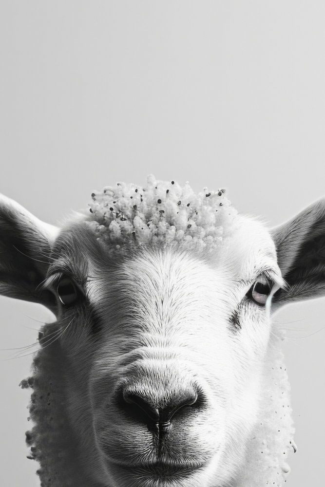 This black and white photograph of a sheep captures the gentle beauty and peaceful expression of the animal. The clear, minimalist image perfectly emphasises the soft texture of the fur and the fine details of the face. A charming work of art that will appeal to nature lovers and lovers of stylish decoration alike.