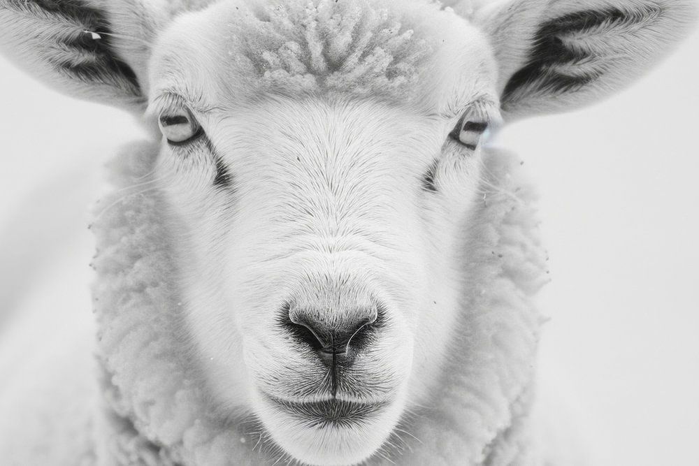 This impressive black and white photograph shows a sheep in all its tranquillity and grace. The fine details of the fur and the gentle expressiveness of the face are emphasised by the monochrome depiction, creating a timeless elegance. Ideal for lovers of minimalist art and admirers of nature.