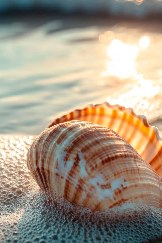 Gentle waves play around the structures of an enchanting shell, its shimmering stripes dancing in the evening sun. The fine foam shines like tiny diamonds on the sandy bottom, while the calm waves tell a melancholy coastal melody. A hint of the sea and holidays is in the air as nature embraces this precious beauty.