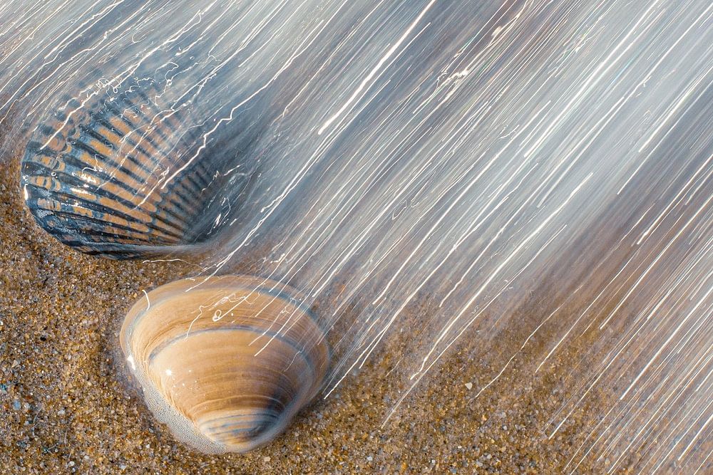 The shells on the water’s edge, photographed as the waves roll in, with the beautiful ripples created by the moving water and the dazzling play of light forming a true work of art.