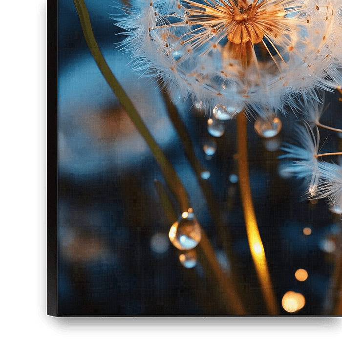 A close-up macro photograph reveals the delicate details of a dandelion fluff bathed in the soft moonlight. The fluff looks like tiny silver threads, each with a tiny dewdrop glistening like a precious jewel. The moonlight casts a subtle glow over the scene, making the fluff seem to float in an enchanting dream world. The dewdrops…
