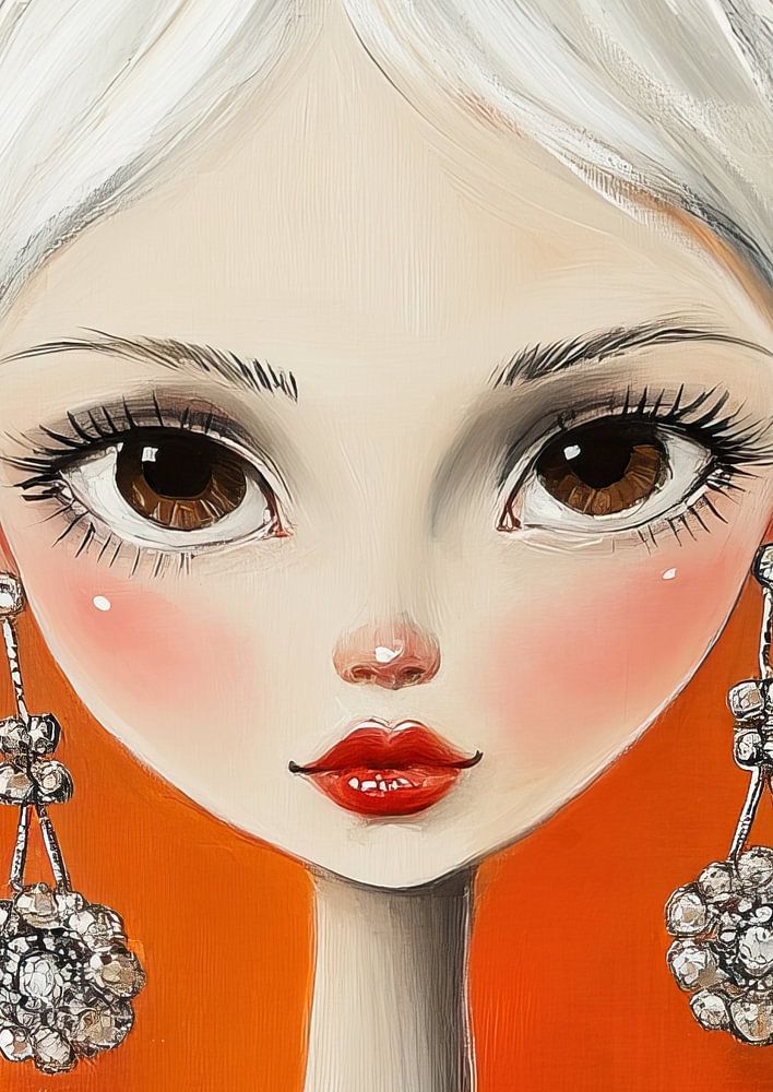 Details: women painting, girl with big eyes, orange background, modern art, elegant earrings, contemporary art, portrait, girl portrait, accessories, stylish
