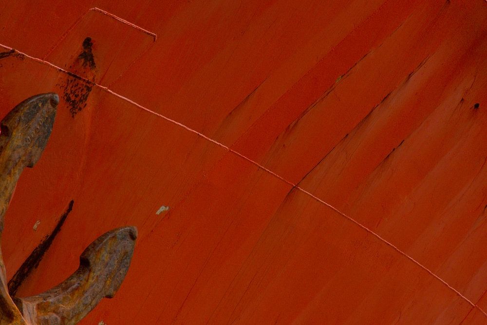 The rusty anchor in the locker hole. The numbers on the fluxes of the anchor the scratches in the paint on bow. The letters of the ship's name. The vents on deck of the tanker.