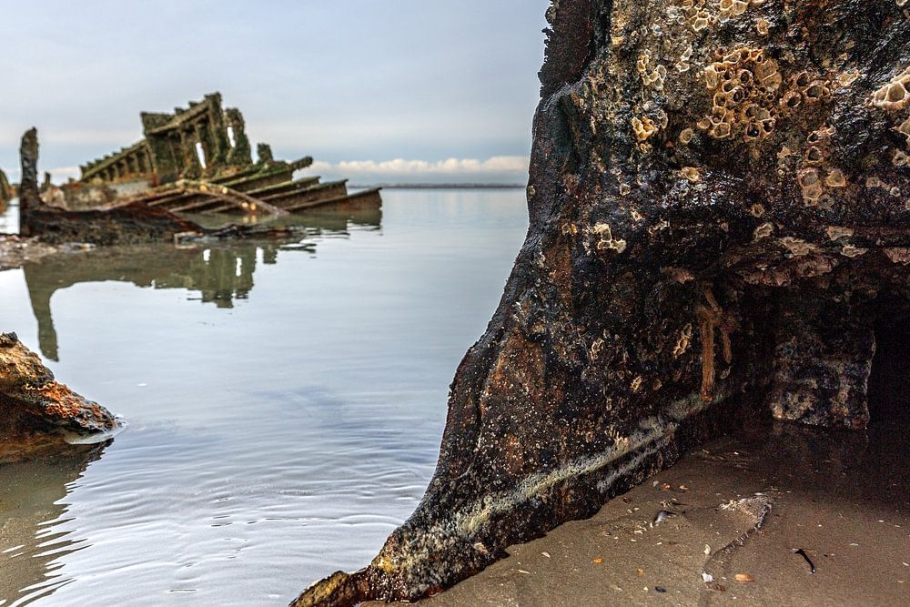 Wide-angle panorama, melancholic mood, details of the rusted steel struts with shell growth, winter, washed over sand, horizon with clouds, dimmed light.