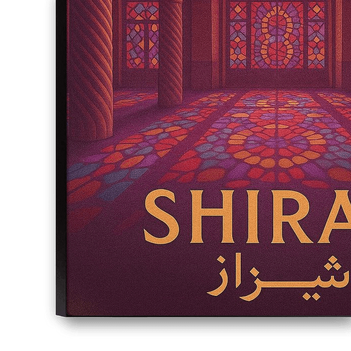 Step into a world of color and light with this mesmerizing illustration of Shiraz. Unlike the exterior landscapes of the other posters, this artwork takes you inside the famous Nasir al-Mulk Mosque, also known as the "Pink Mosque." The design focuses on the breathtaking play of light through the stained-glass windows, casting a…