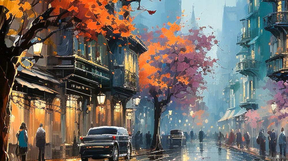 About "Shopping tour in a city with autumnal trees at night Art Painting"