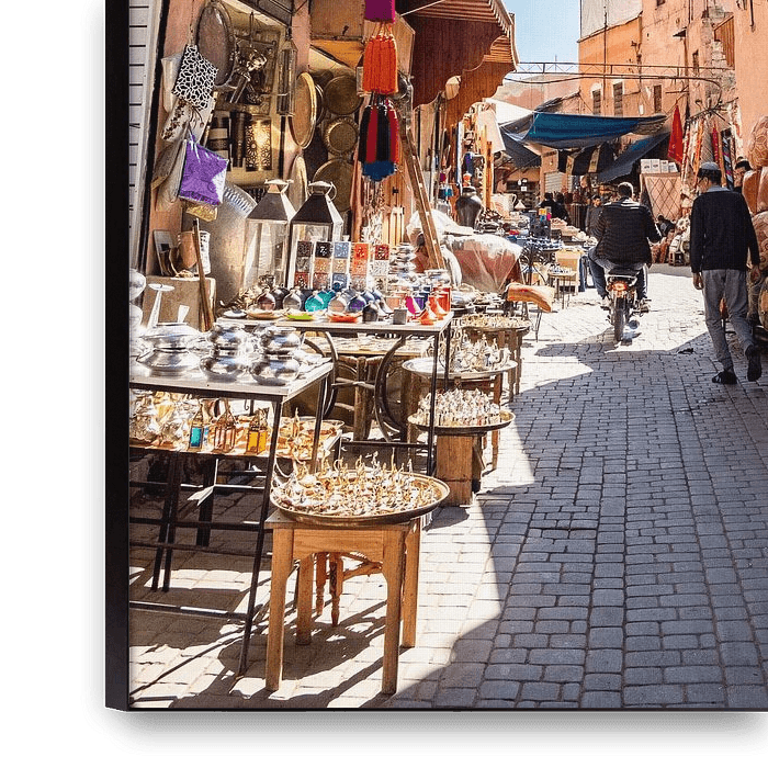 Full street with shops where everything is sold. This is what life in Marrakech looks like. The canvases provide some shade in this warm country.