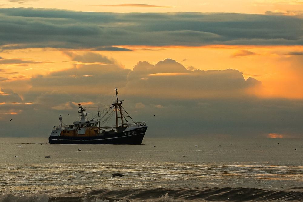 Fishing boat shrimp cutter off the coast of Zandvoort at sunset