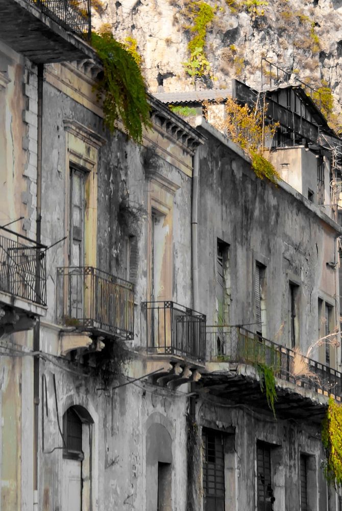 A row of old houses along a street on the Italian Mediterranean island of Sicily.