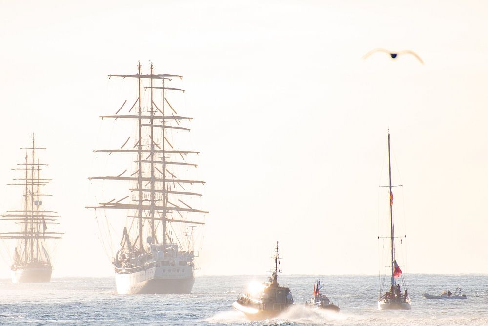 End of Sail Amsterdam the ships slowly disappear from view in the sea mist on the North Sea with the setting sun as an added bonus.