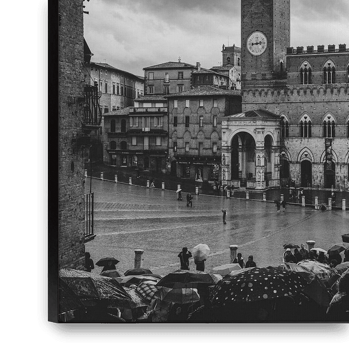 One of the most beautiful viewpoints in Siena's Piazza del Campo, overlooking the Torre del Mangia during a heavy rain.