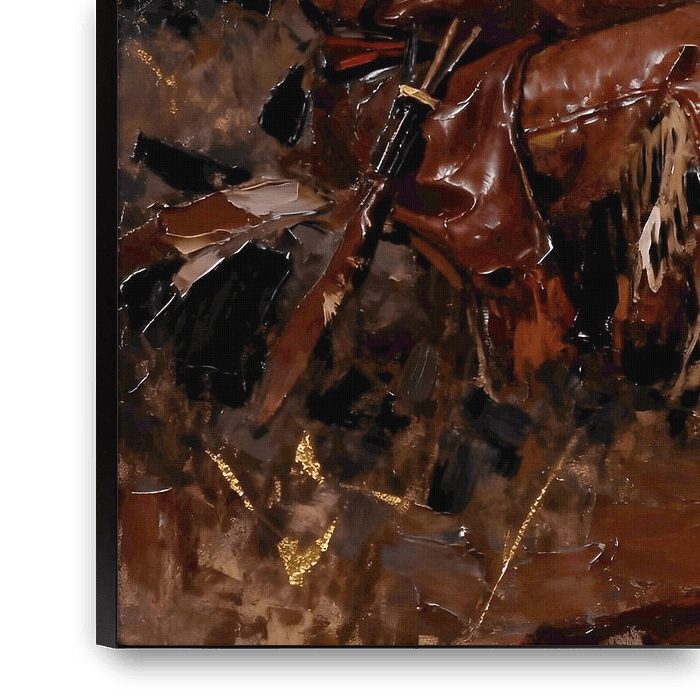 A Native American man sits quietly beside a glowing campfire, his feathered headdress outlined against a vast, radiant sunset. The sky unfolds in layers of ember red, molten gold, and deep violet, its warmth contrasting with the calm, dark silhouette of the figure. Firelight dances across the ground, creating a gentle rhythm between…