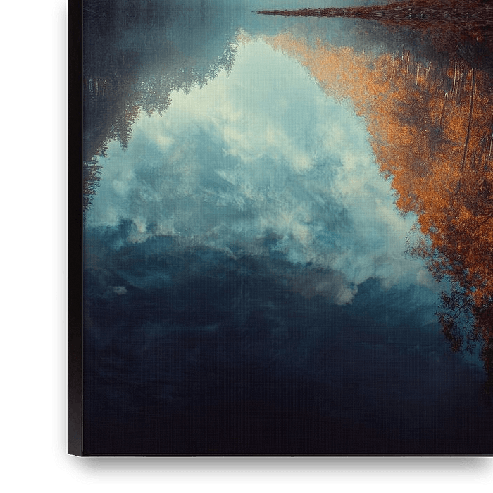 A tranquil autumn landscape unfolds along a calm river, where golden brown trees are reflected in deep blue water. The air is heavy with movement, but the surface remains untouched, as if time has paused here for a moment. Light breaks softly through the foliage and bathes the banks in a warm glow, while shadows bring depth and…