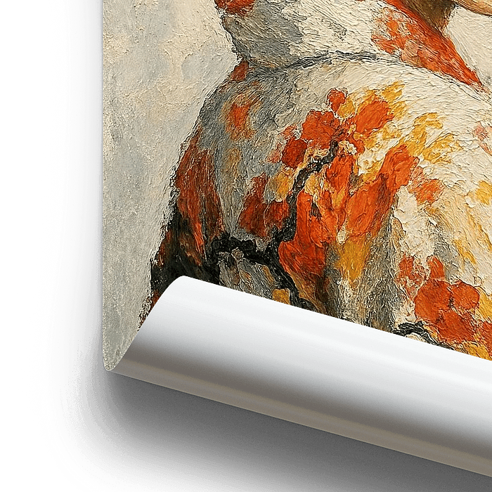 In this painting, we see a young woman in an ornate kimono, subtly turning around and looking directly at the viewer. The thick, vibrant brushstrokes bring her to life; the red hair ornament, the soft shadow under her chin and the layered texture of her clothing make this work unique. The atmosphere is hushed and intimate, with a warm glow of orange and ochre yellow. It evokes a sense of nostalgia and sophistication. In an interior, this work brings tranquillity and beauty. Perfect for those who love Japanese aesthetics, textile art or cherishing the moment in all its elegance.