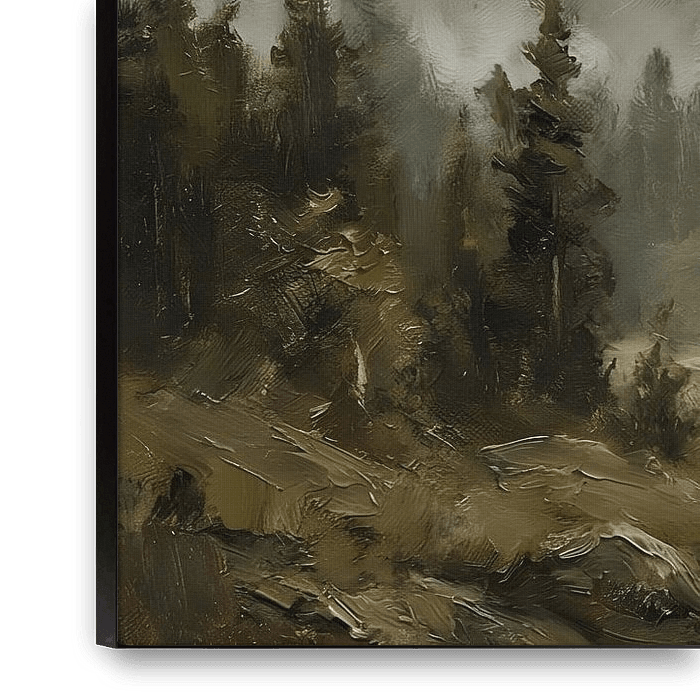 A soothing oil painting of a vast mountain landscape surrounded by soft, green pine forests. The colours are deliberately kept muted and natural, giving the work a calm and harmonious feel. A light mist floats between the trees and mountain slopes, adding depth and mystique to the scene. A small deer runs in the distance, subtly…