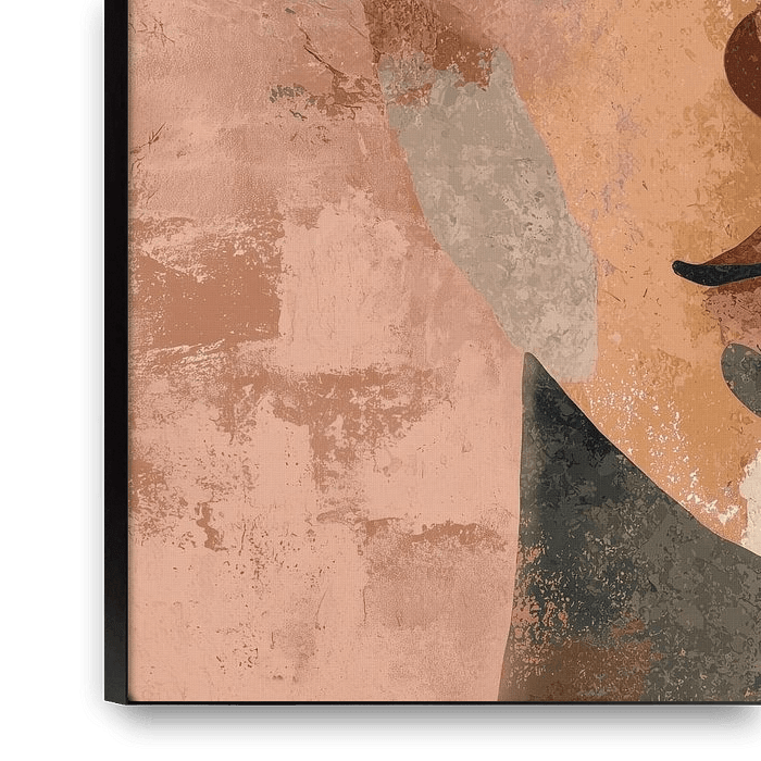 Abstract portrait in which the contours of a face are subtly rendered with geometric shapes and soft areas of colour. Warm tones of terracotta, beige, ochre and soft greys blend together, creating a harmonious whole. The skin texture appears almost weathered, as if the portrait has been captured in a wall or stone, giving the work a…