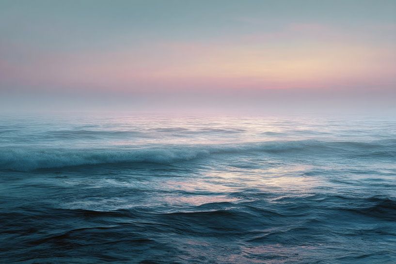 This tranquil seascape depicts a moment when the world almost dissolves into colour and light. The horizon fades into a soft mist, while pastel shades of pink, blue and green spread gently across the sky and water. A single wave rolls calmly forward, like a breath that makes the rhythm of the sea palpable. The image exudes openness and…