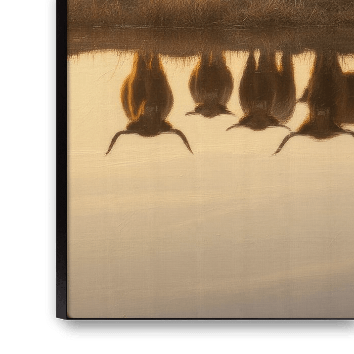 A herd of Scottish Highlanders in the soft morning light. The warm golden tones, serene water reflection and quaint style bring a sense of stillness and natural beauty to every room.