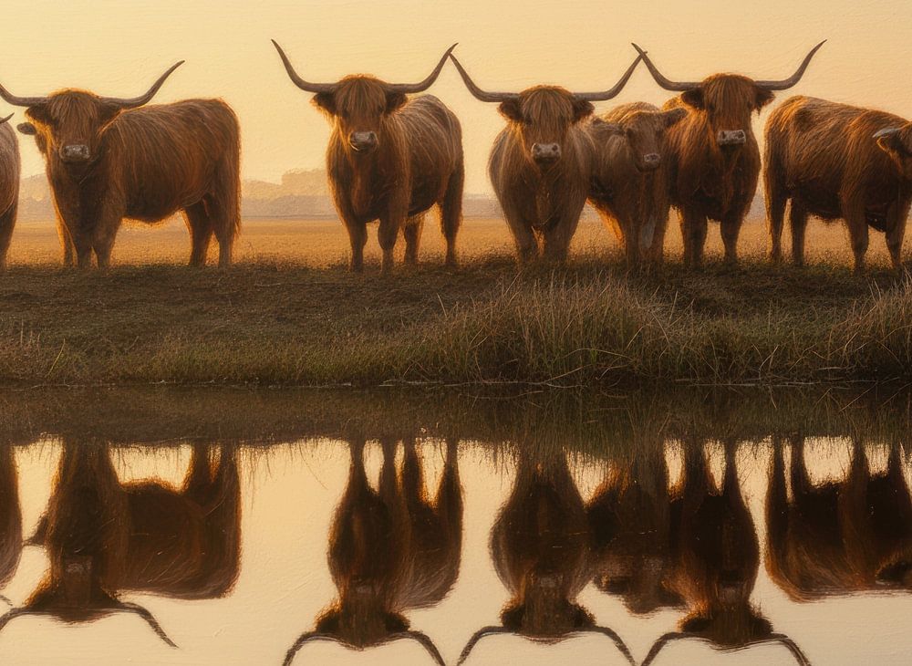 Buy this landscape artwork Silence on the Water, Highlanders in the Morning Sun by By Marjolein Design on canvas, ArtFrame, poster and wallpaper, printed on demand in high quality.