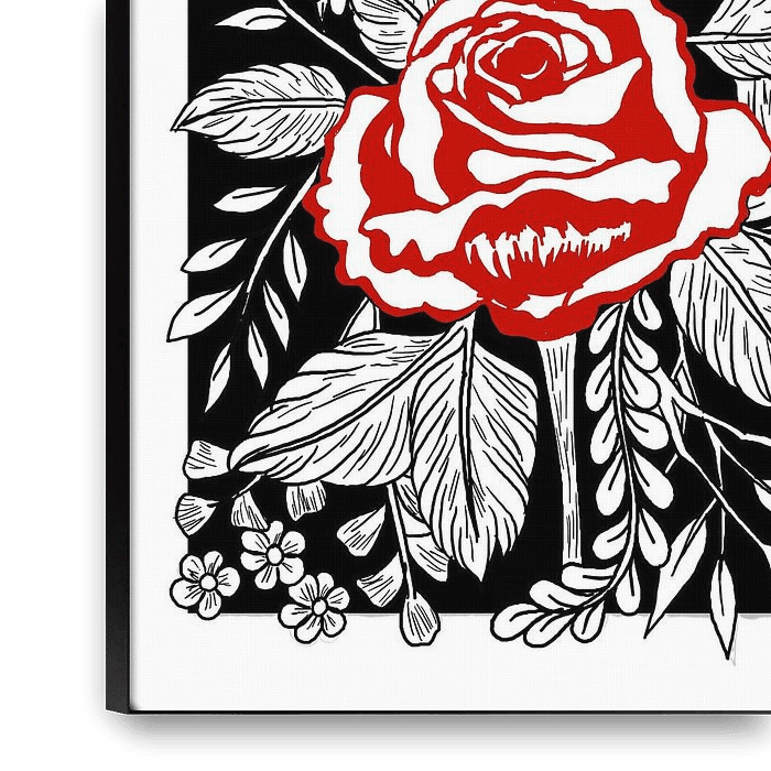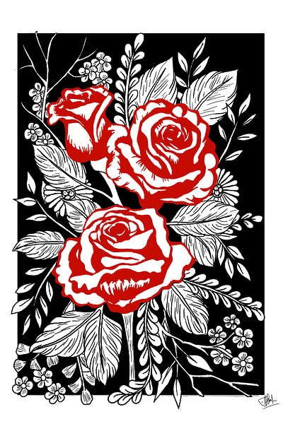 This artwork portrays a group of blooming roses surrounded by delicate leaves and small wild flowers. The strong contrast between the dark background and the bright floral shapes creates a powerful visual rhythm. When looking closer, subtle line textures appear in the petals and leaves, giving the illustration depth and movement. The…