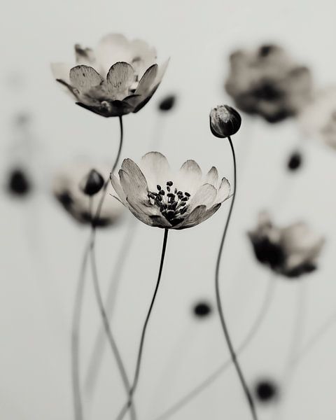 A delicate black-and-white floral composition with soft focus and airy stems, evoking calm, elegance, and quiet movement—perfect for minimalist and modern interiors