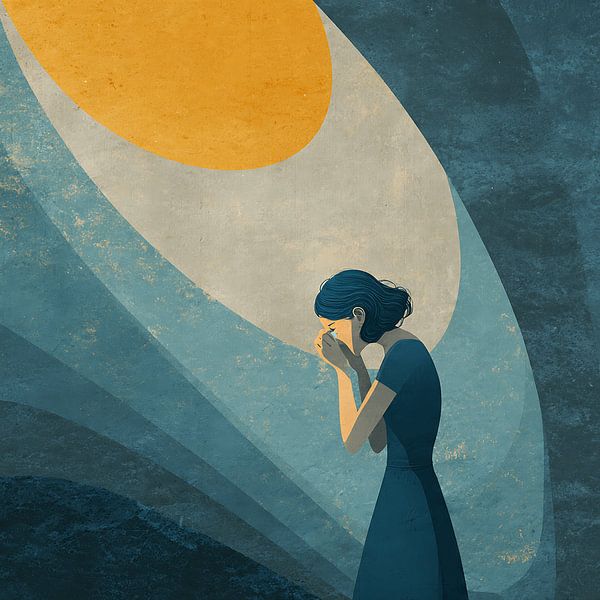 This emotional wall art captures the quiet weight of depression through symbolic vintage digital art and flat illustration style. A solitary figure dissolves into butterflies, representing fragile thoughts drifting away into silence. The soft muted palette and textured finish create a nostalgic vintage art atmosphere blended with subtle…