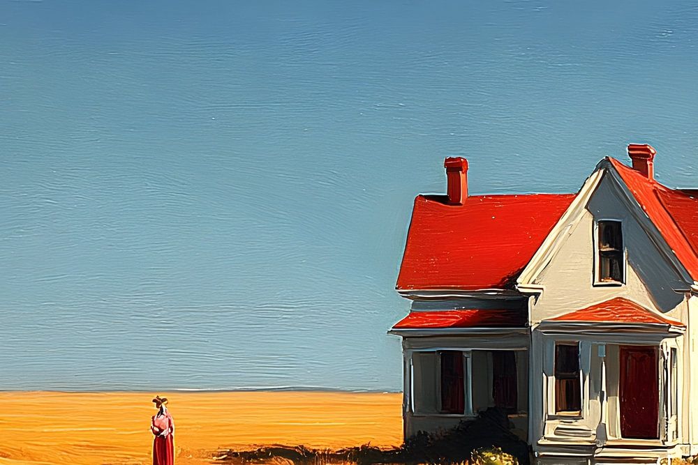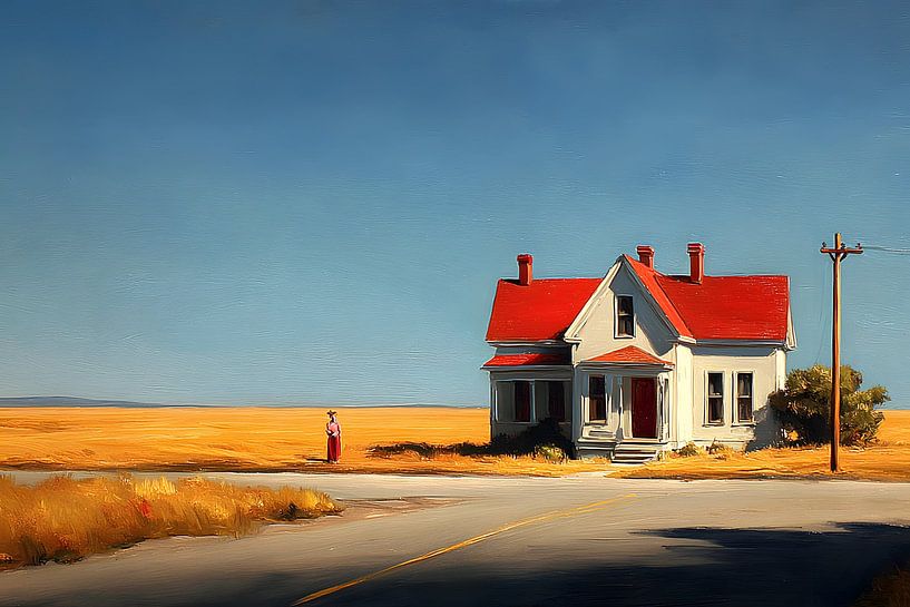 A lonely white wooden house with a red roof stands on an empty country road. The vast ochre-coloured field stretches to the horizon. A single woman in red clothing stands apart from the house, small in the space, almost lost. No movement, no traffic, just sky, road and silence.