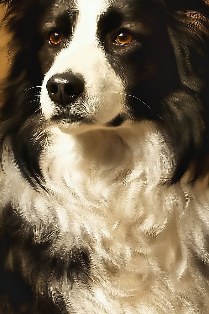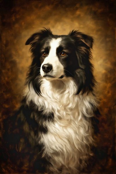 This portrait shows a calm and alert-looking Border Collie against a warm, picturesque background. The emphasis is on the dog's intelligent nature, not action. Fine-art lighting and texture give it a classic, timeless look reminiscent of an oil painting.