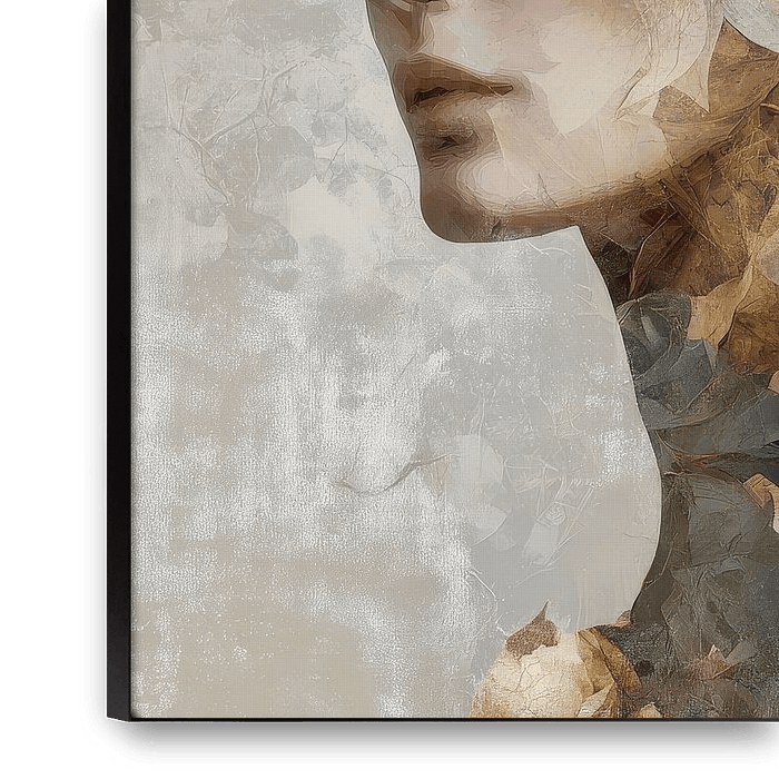 Silent Harmony is a refined, artistic portrait in which a female profile is subtly interwoven with organic shapes and autumn leaves. The soft beige, sand and brown tones give the work a warm, calm appearance.