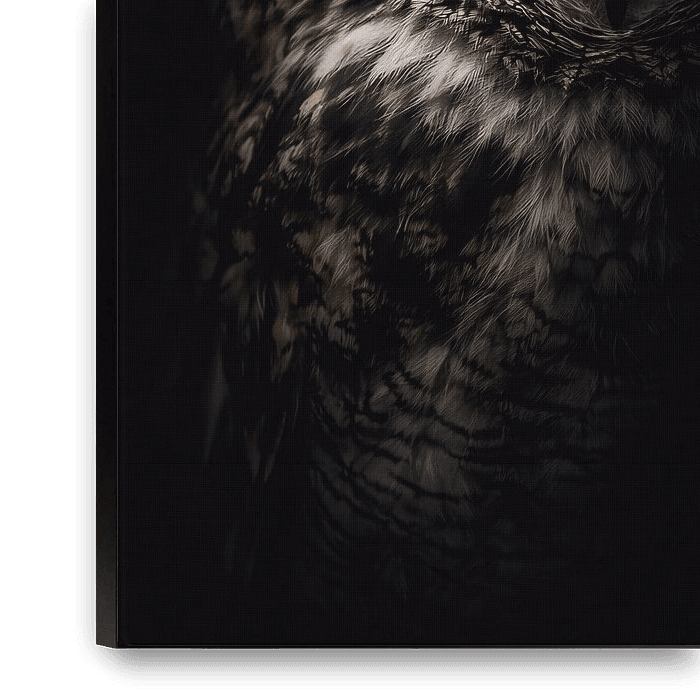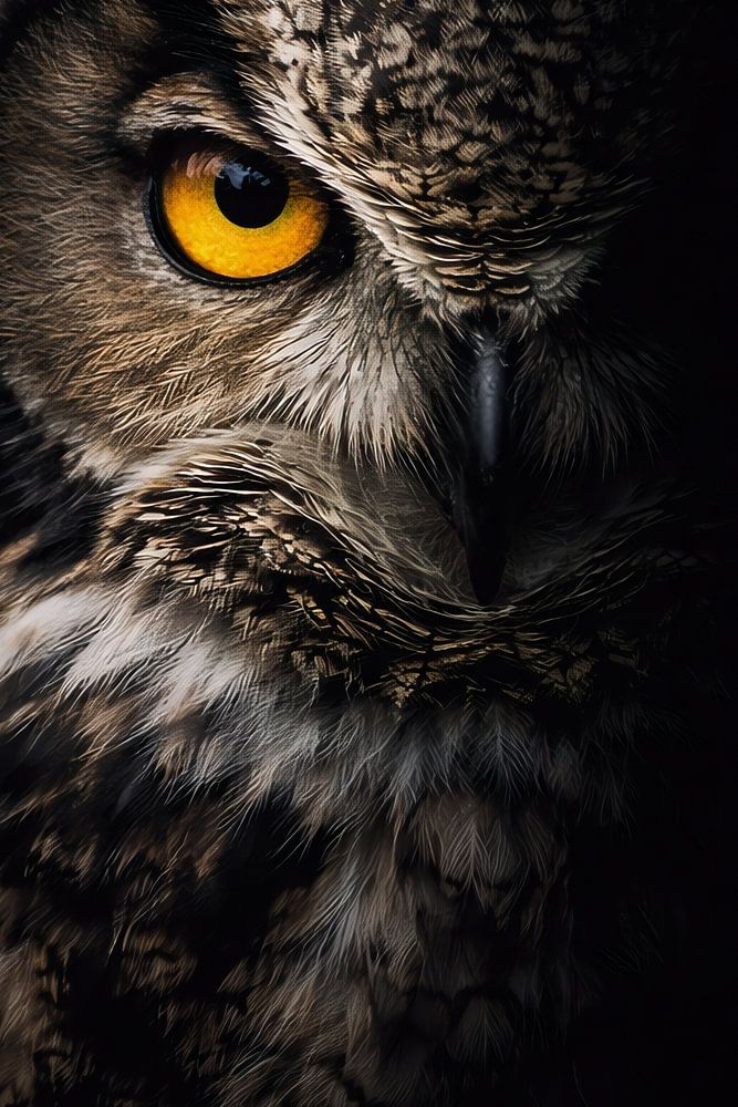 A captivating owl portrait captured in dramatic low light, highlighting a glowing amber eye that symbolizes wisdom and quiet strength. The detailed feathers and deep shadow background create an elegant and mysterious atmosphere. This artwork evokes calm focus and introspection, making it perfect for a bedroom, reading corner, home…