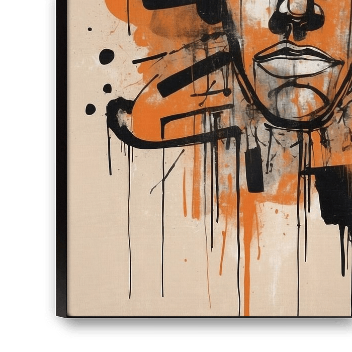 An expressive and raw portrait that exudes Basquiat's energy. Coarse black lines, dripping paint and spontaneous brushstrokes give this work an unpolished, powerful look. The palette of orange, beige and black creates tension and contrast, while the layered textures and graffiti influences create an urban, contemporary vibe.