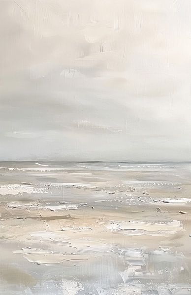 Subtle and soothing interpretation of a seascape, executed with a monochrome palette of white and grey tones. The texture of the painting, achieved by using thick layers of paint and scraping the surface, adds depth and dynamism, mimicking the effect of moving water and foaming waves. The horizon is faint and almost imperceptible,…