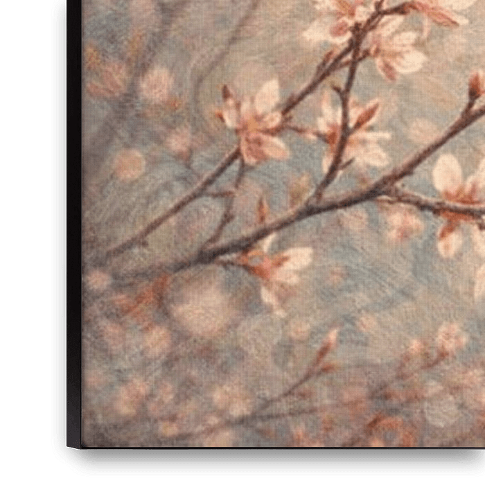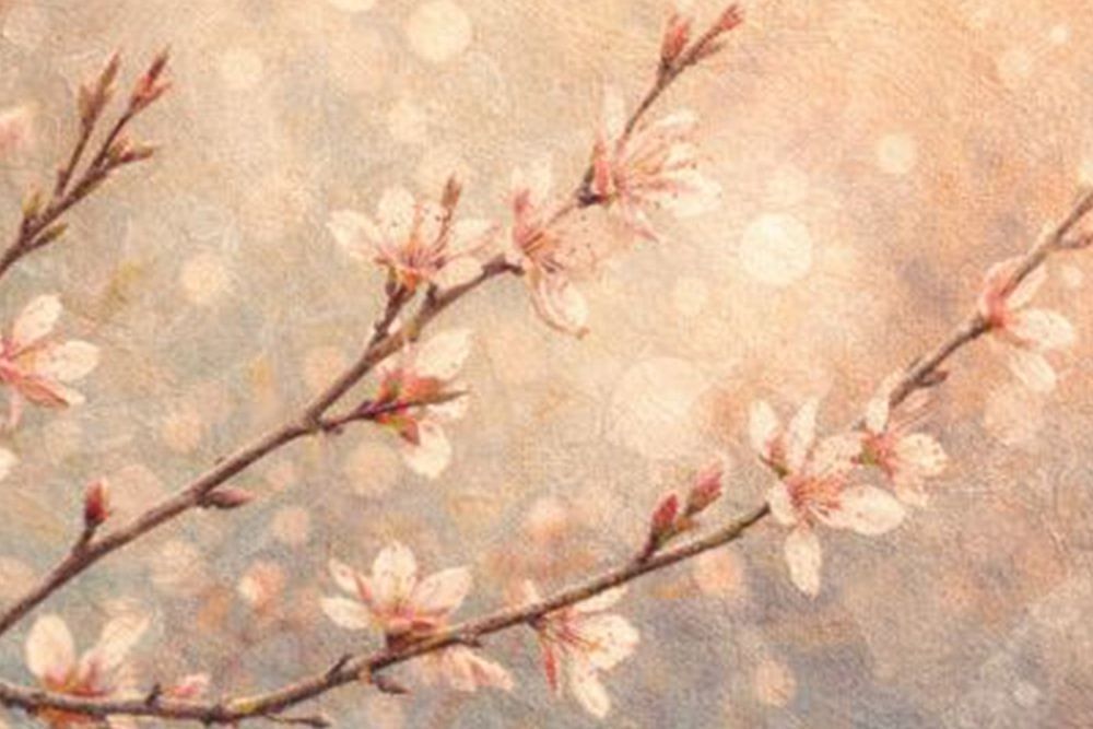 "Silent Branches" is a calm, poetic work of art that captures the ephemeral beauty of nature. Delicate twigs and small flowers seem to gently emerge from the background, almost as if they had been applied to handmade paper or canvas.