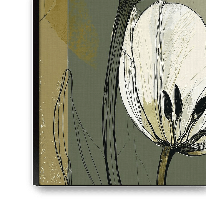 What is special about this work is the layered background in which abstract shapes and structures are visible. These add an extra dimension without taking attention away from the flowers. The composition is perfectly balanced: one flower points proudly upwards, while another leans slightly forward, evoking a sense of interaction and movement. The choice of subdued colours and natural lines brings tranquillity and sophistication to the whole.