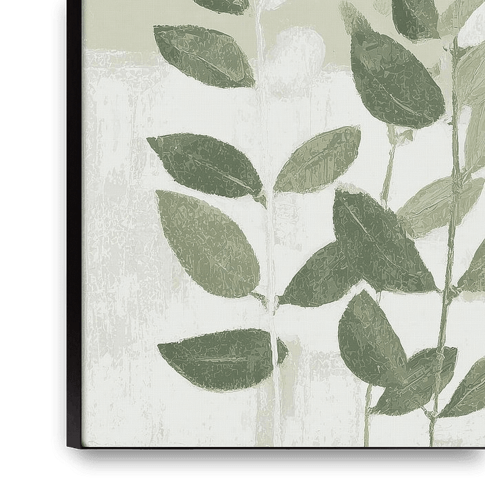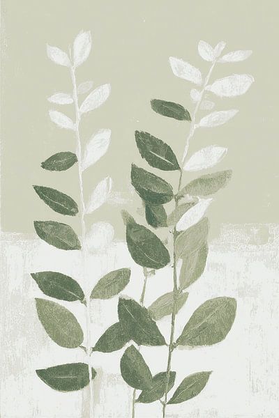 elegant branches with oval leaves moving rhythmically upwards. The style is minimalist and soothing, with a subtle layering of texture and colour. The leaves are done in different shades of green and white, creating a nice contrast and a sense of depth. The background is soft grey-green with a slight subdivision between top and bottom…